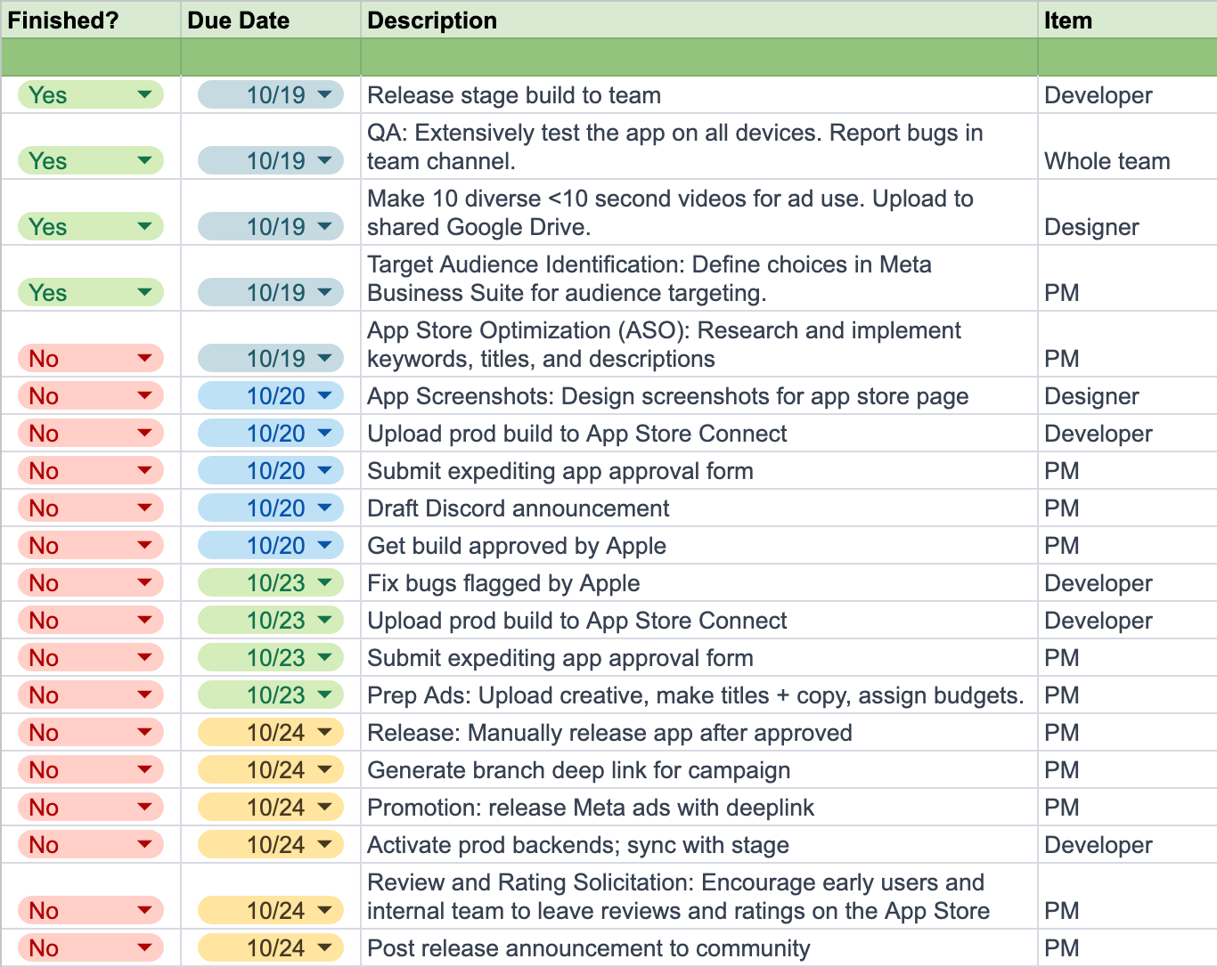 Because you’re a very much an adult-run startup, totally not a bunch of kids who don’t know what they’re doing, you establish a process for releasing and promoting each new version of your app. We assume you’re only launching on iOS and have a small team of three — developer, designer, and PM. You parallelize as many steps as possible, since iteration speed foretells startup success.